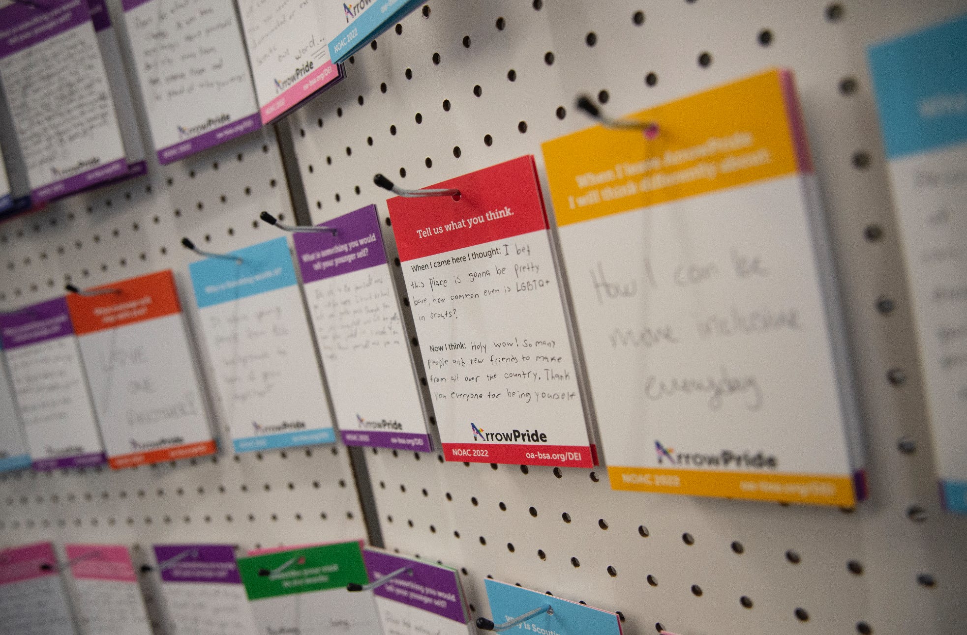 About a dozen scouts amble in all at once, sucked like a magnet toward the activity closest to the doors: The question board. As they write and hang their responses to prompts like, “What is your wish for future generations of LGBTQ+ scouts?” and “What is something you would tell your younger self?,” more delegates filter in.